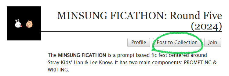 Navigate to the MINSUNG FICATHON Round Five AO3 Collection, and click the button that says 'Post to Collection.' That should take you to the regular AO3 New Post page, from where you simply post your story accordingly.